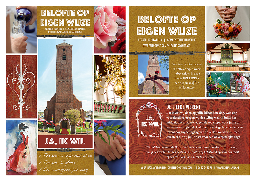 Flyer ontworpen voor Belofte op eigen wijze, voor een unieke bruiloft in de Dorpskerk Wijk aan Zee. Voor de flyer zijn er tevens professionele foto’s gemaakt van de buiten-en binnenkant van de kerk.