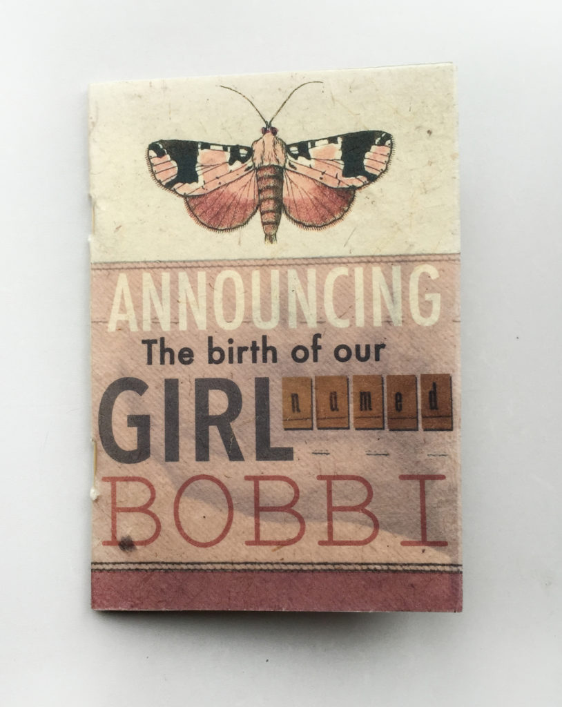Een heel speciaal geboortekaartje voor Bobbi. Het kaartje is een klein boekje geworden met een oudpapieren (doorzichtige) omslag die bedrukt is met aan de binnekant stevig natuurlijk papier, gebonden met een houten stokje. Alle kaartjes zijn met de hand gesneden en gebonden.