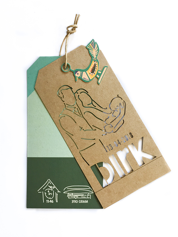 Uniek en persoonlijk geboortekaartje speciaal ontworpen voor Dirk! Het kaartje bestaat uit 2 labels. De voorkant is een illustratie van het gezin die gelazerd is. Door de kleuren van het 2e label geeft dit een speels kleurrijk effect! Ook de huisvogel heeft een mooie plek gekregen bij het geboortekaartje!