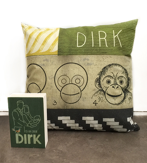 Voor Dirk is tevens een persoonlijk geboorteblokje en geboortekussen ontworpen. Het geboorteblokje is op een dik stuk hout geprint.