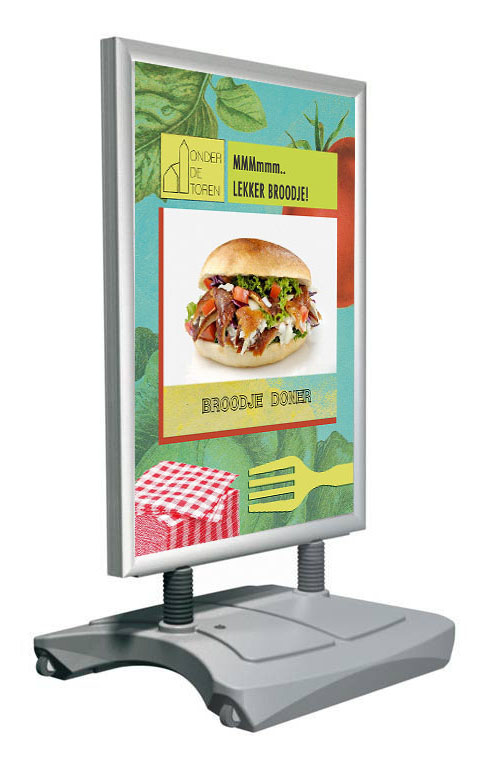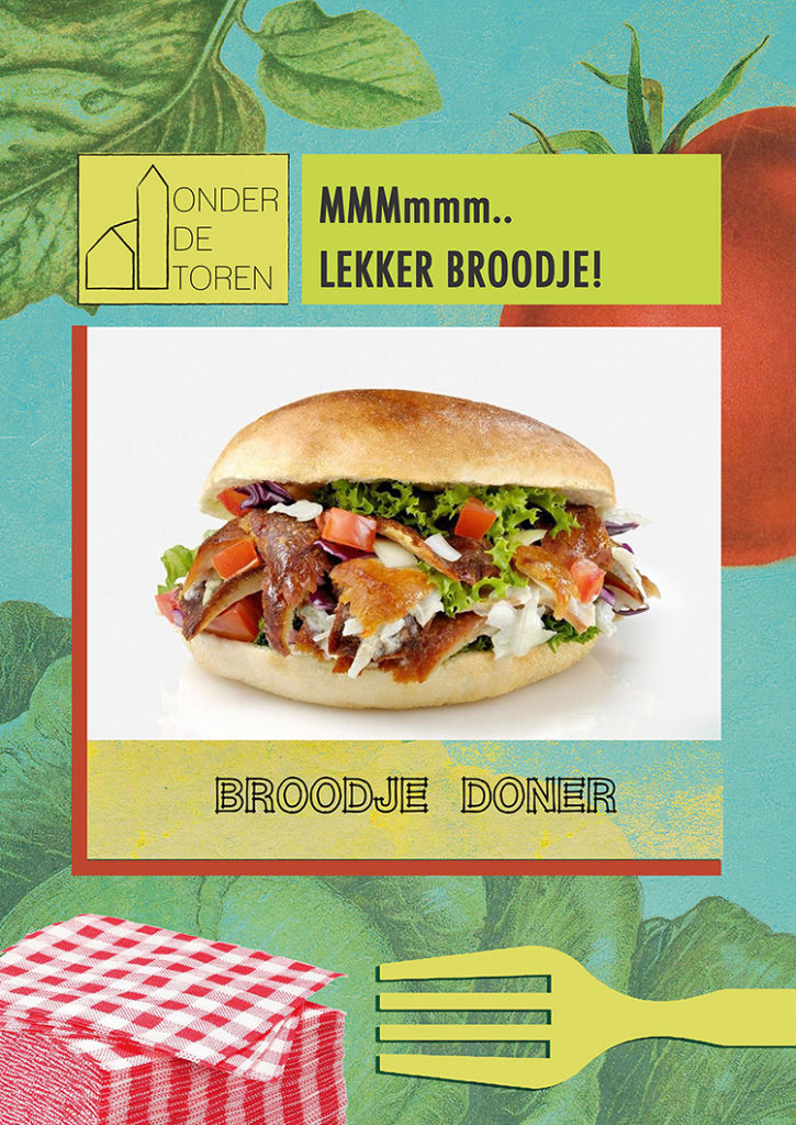 Logo ontwerp en smaakvolle posters voor de snackbar Onder de Toren Wijk aan Zee. De posters staan op het terras in stoepborden. Door de frisse kleuren vallen ze meteen op! Daar krijg je toch trek van?
