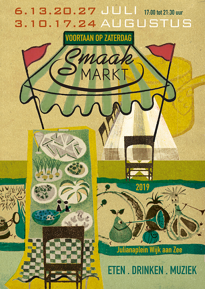 Voor het jaarlijks terugkomend evenement in Wijk aan Zee, de Smaakmarkt, zijn er weer nieuwe promotie uitingen ontworpen: Posters, flyers, visitekaartjes, social media uitingen en de website heeft ook weer een nieuwe look gekregen! Elke zaterdag komen mensen uit Wijk aan Zee en omgeving samen op het Julianaplein om gezamenlijk te eten, genieten van muziek en het mooie weer. Het dorpse gevoel, samenkomen, muziek en het plezier zit verwerkt in het ontwerp van de promotie uitingen.